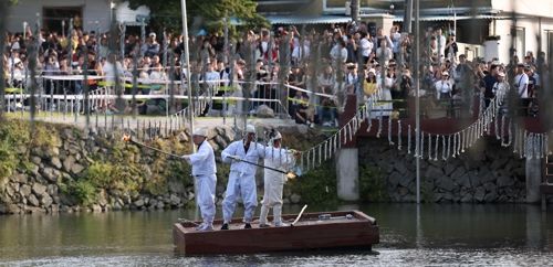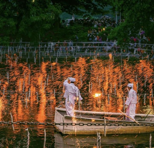 낙화에 불을 붙여 꽃가루처럼 물 위에 날리는 불꽃놀이로 실제로 축제에 방문하면 정말 수없이 떨어지는 불꽃들의 향연이 이로 말할 수 없는 아름다움을 선사합니다.
